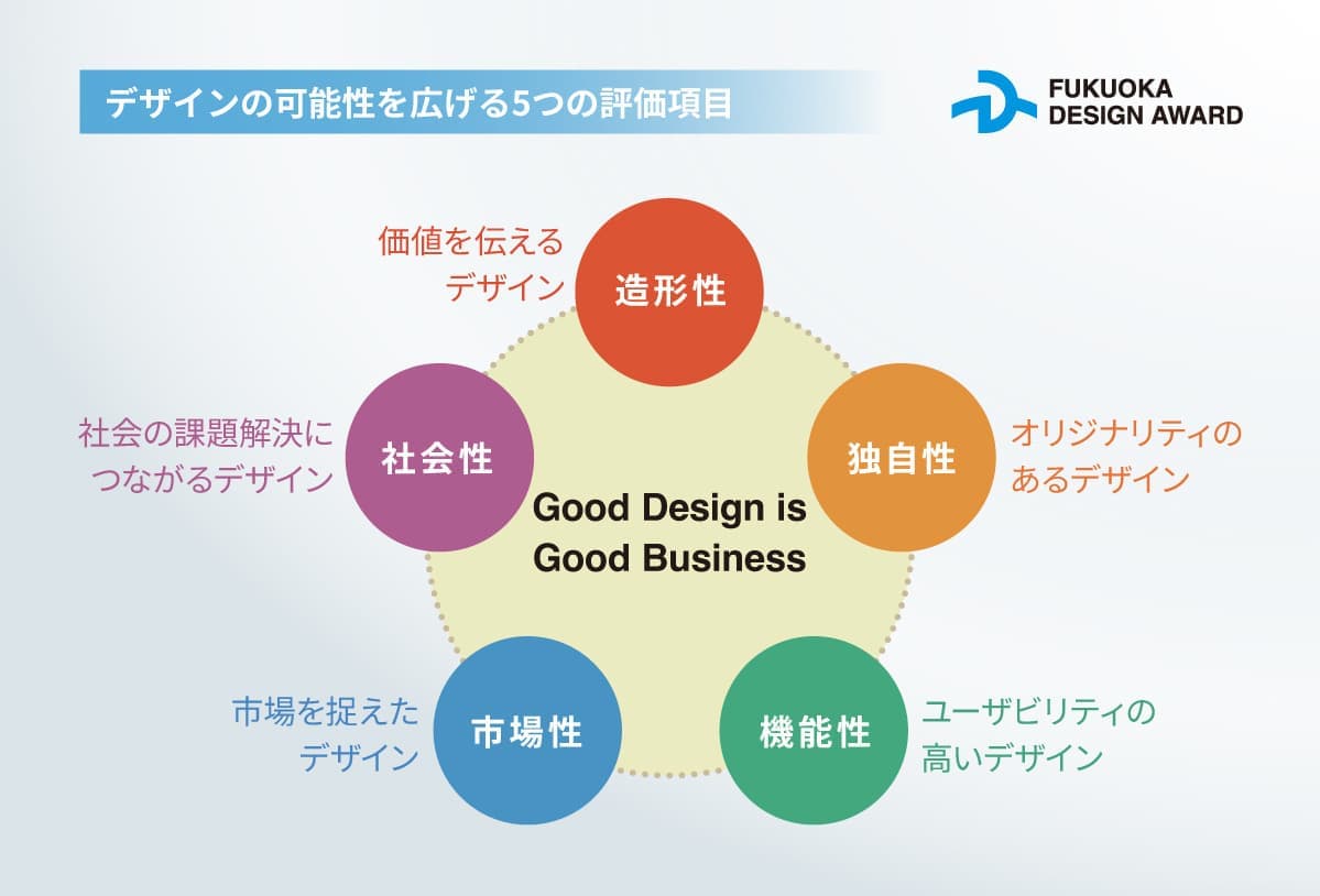 FDAは、スローガン「グッドデザイン・イズ・グッドビジネス」に加えて、「デザインの可能性を広げる5つの評価項目」を設けています。それらが互いに関連し、相乗効果をもたらすデザインを審査・表彰いたします。